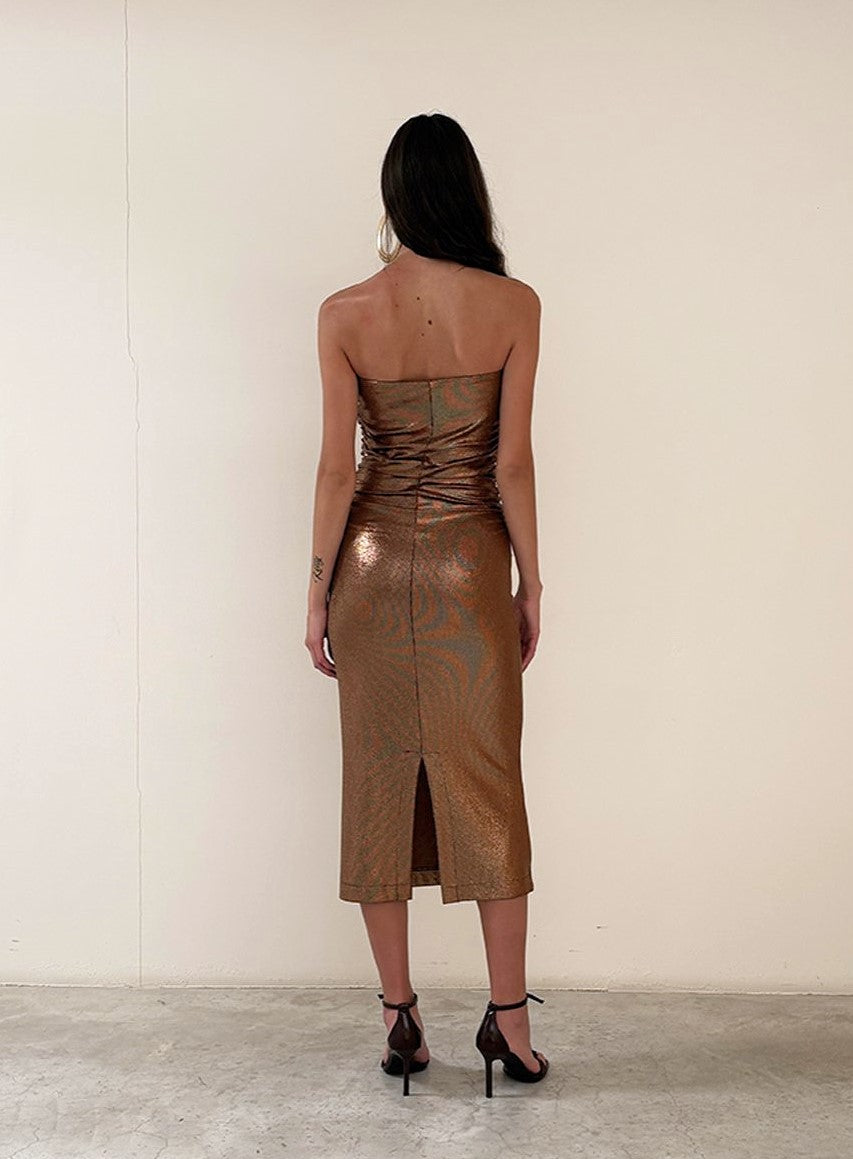 Abito in jersey spalmato, a fascia, con arricciatura sul fianco, elasticizzato e molto confortevole,