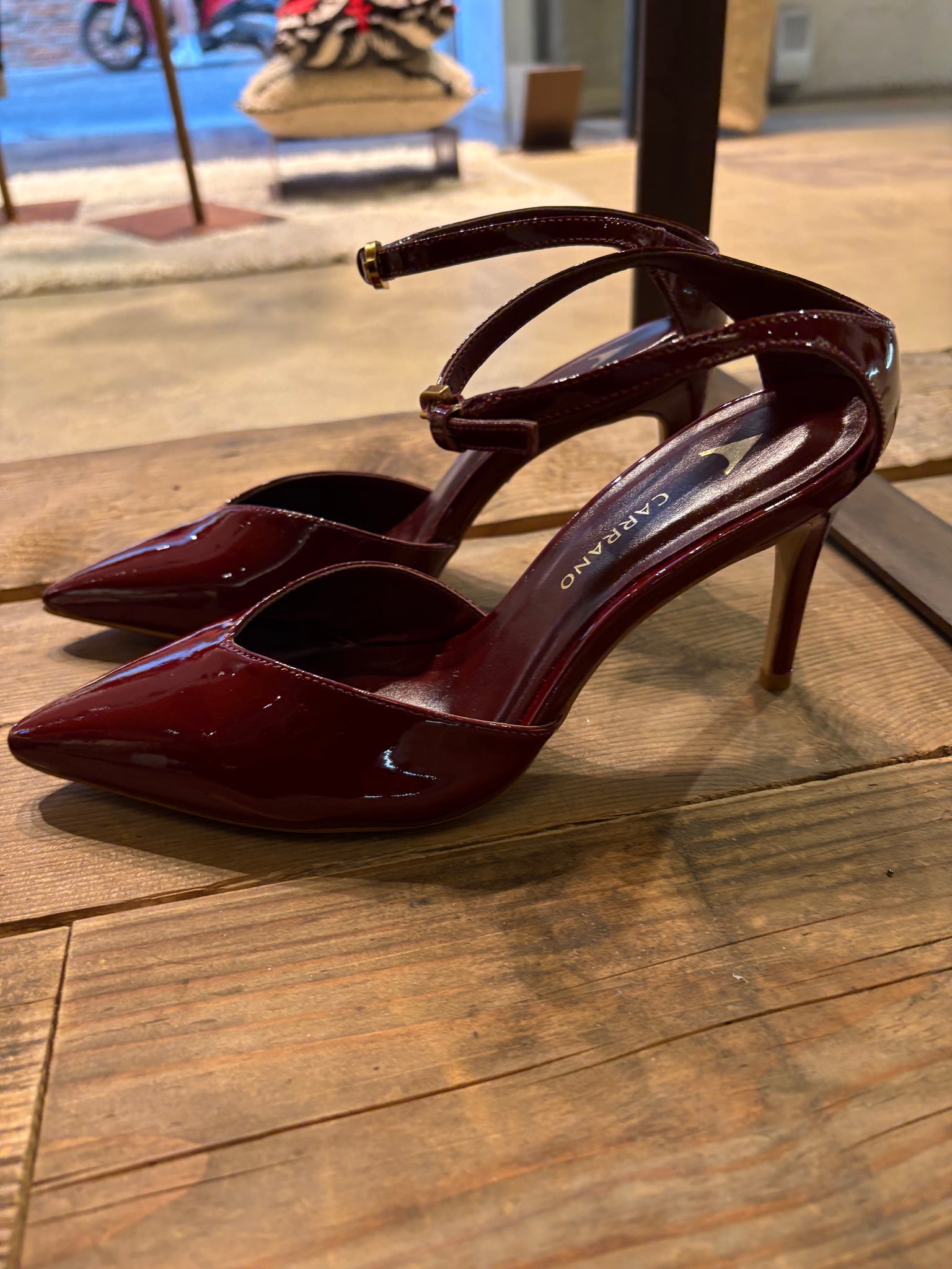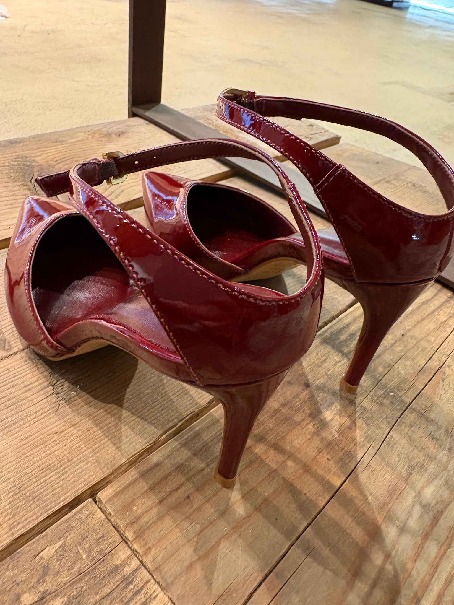 Chanel in vernice bordeaux, tacco 9, cinturino alla caviglia tallone scollato.