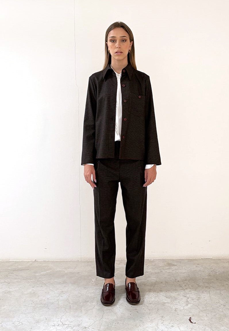 Camicia in tela di lana, slim fit, con tasche applicate, fantasia piccolo check tono su tono, dal grigio scuro e nero al bordeaux