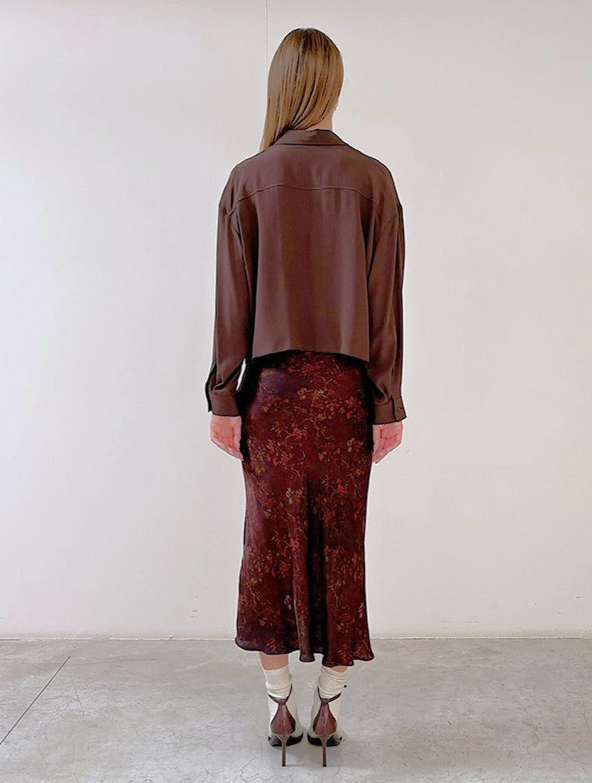 Camicia cropped, manica lunga, collo a uomo, in seta viscosa, elegante e versatile.