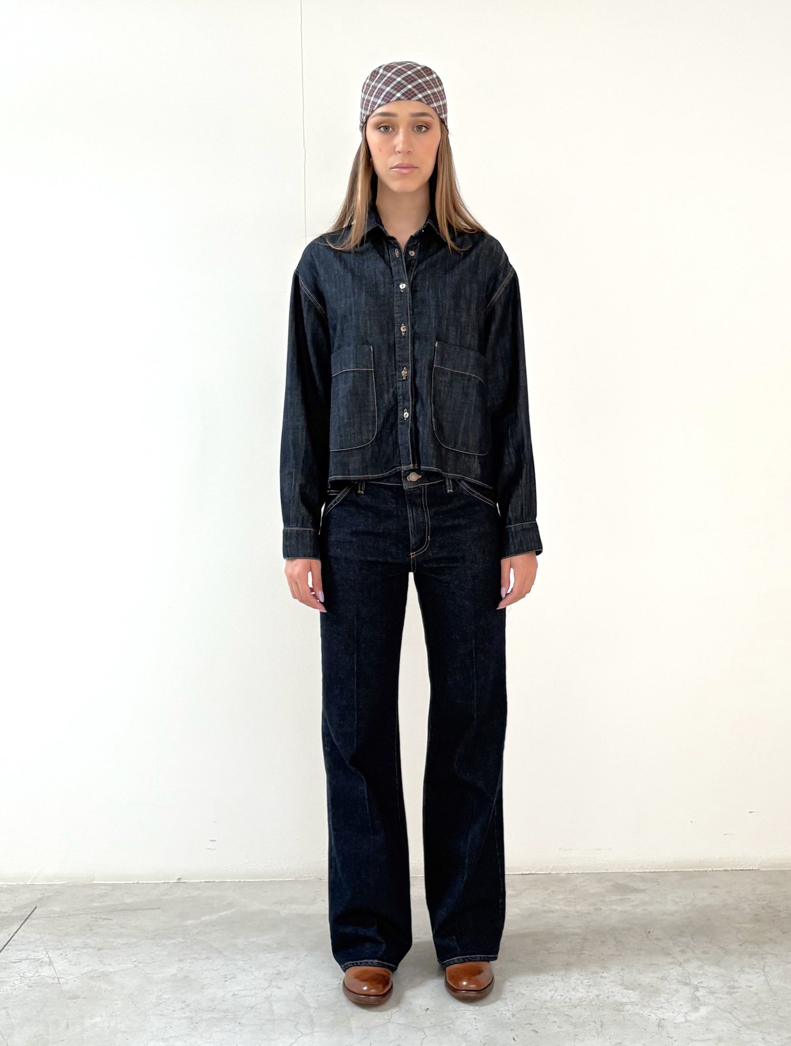Giacca camicia, corta, cropped, tasche a toppa applicate sul davanti, tela ferma, lavaggio dark blue, 6 OZ.