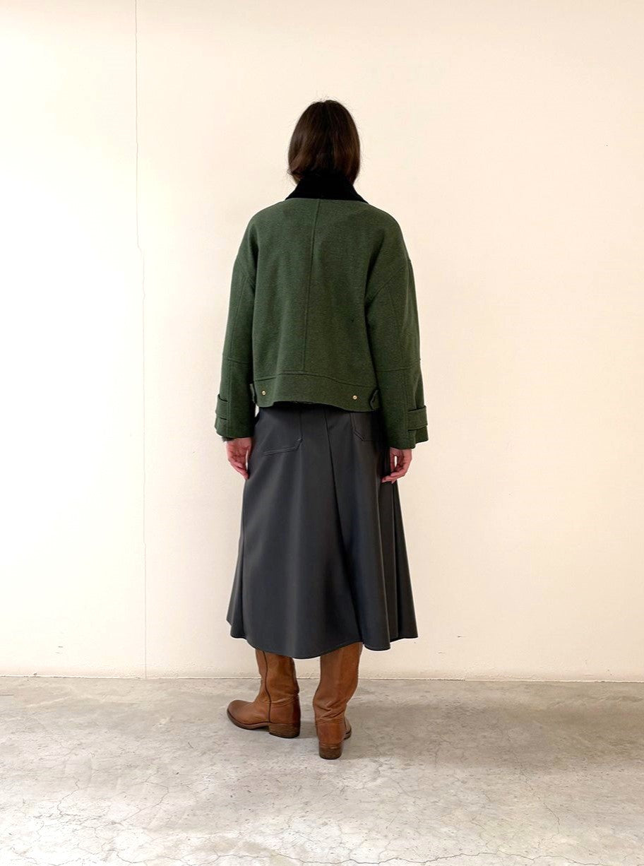 Caban a giacca, in shetlad doppiato e imbottito, tasche esterne applicate, collo camicia in velluto liscio a contrasto.