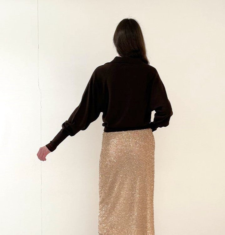 Maglia in pura lana merinos, scollo a polo, lunghezza in vita, manica raglan.